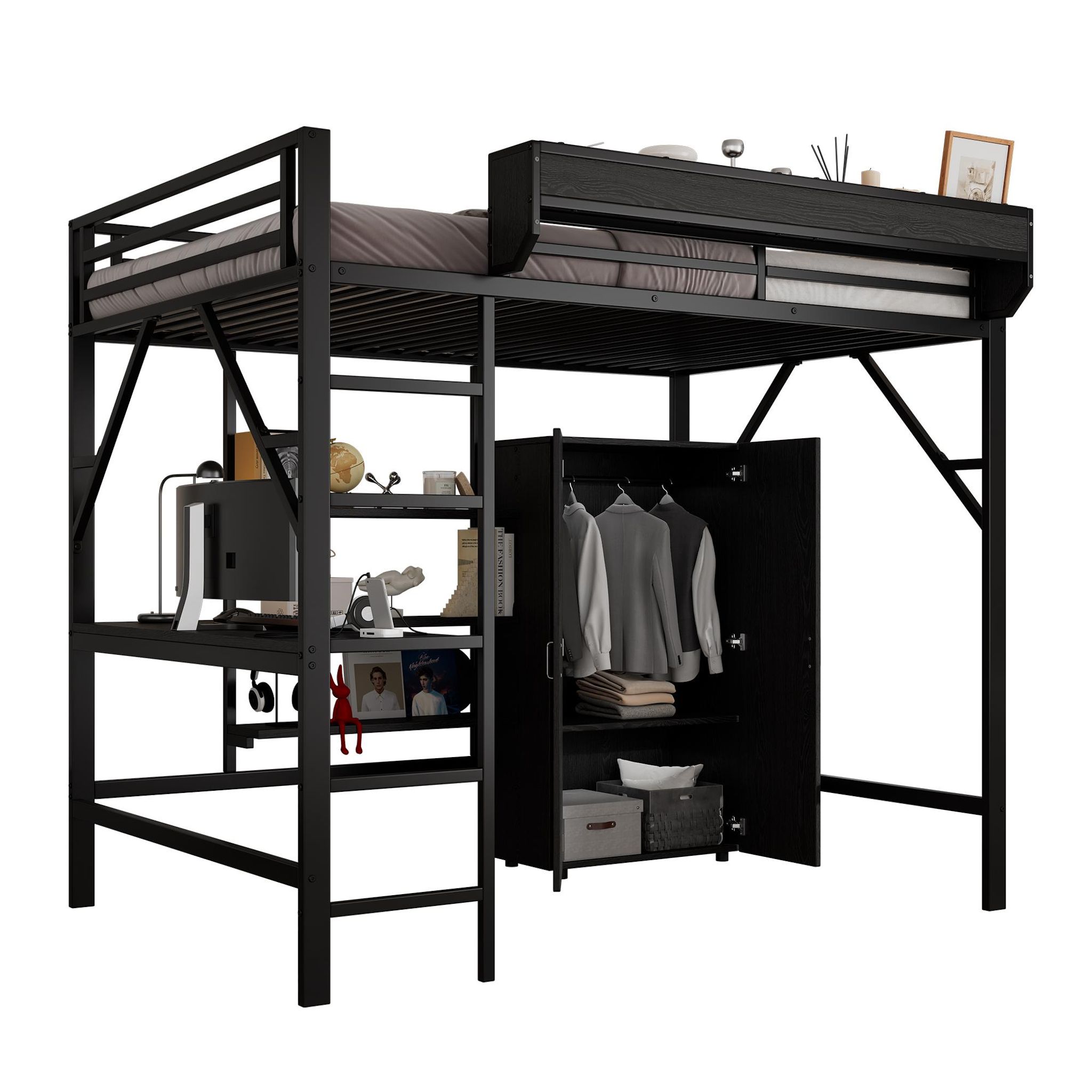 Armoire intégrée : Grâce à son armoire intégrée, le lit mezzanine offre un espace supplémentaire pour les vêtements des enfants et facilite le rangement.