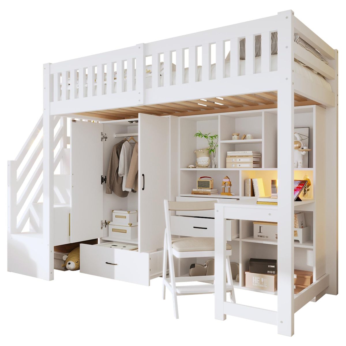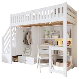 Rangement optimal : À gauche du lit se trouve une armoire de style échelle avec de nombreux rangements : placard, étagères ouvertes et tiroirs. Ce meuble offre un espace de rangement généreux et convient parfaitement aux vêtements, fournitures scolaires et objets de décoration.
