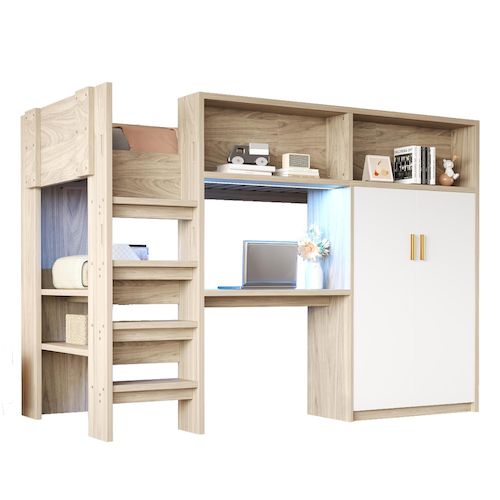 Rangement intégré sous le lit avec éclairage LED – Ce lit mezzanine est équipé d'un bureau et d'étagères à plusieurs niveaux en dessous, créant un espace idéal pour étudier ou pratiquer ses loisirs. L'éclairage LED sous le lit offre une lumière d'ambiance réglable et souligne le style moderne.