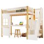 Aménagement multifonctionnel de l'espace : Le niveau supérieur est dédié à la chambre, tandis que le niveau inférieur est équipé d'un bureau, d'étagères de rangement multicouches et d'une armoire échelle, combinant ainsi les fonctions de couchage, d'apprentissage et de rangement, optimisant ainsi l'espace vertical.