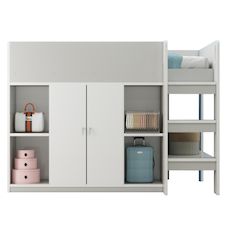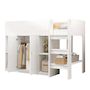 Design compact – Le lit mezzanine offre un espace de rangement supplémentaire en dessous, idéal pour les petites pièces. Des étagères et un placard offrent un espace pratique pour ranger jouets et vêtements.