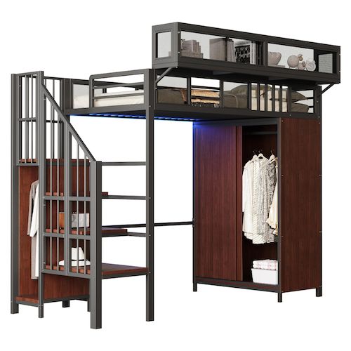 Conception gain de place – Ce lit mezzanine en métal combine un espace de couchage et un espace de rangement dans l'armoire, tout en créant un espace ouvert spacieux en dessous. Cet espace polyvalent peut servir de bureau, de coin lecture ou de solution de rangement personnalisable.