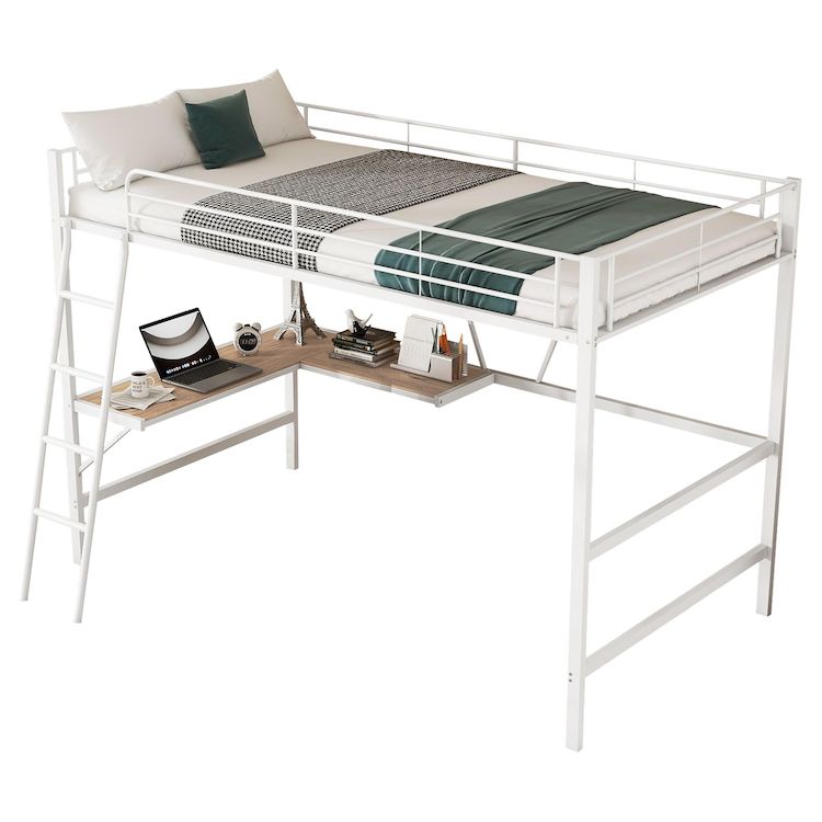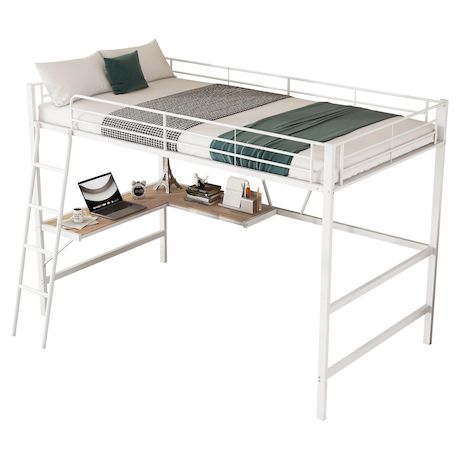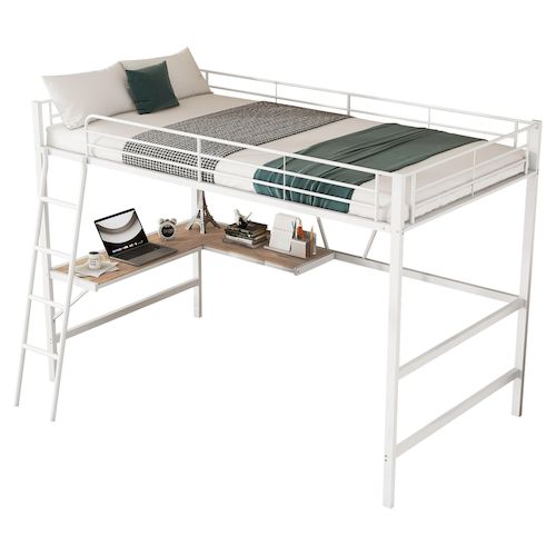 Fonctionnalité : notre lit mezzanine est livré avec un bureau en forme de L et une étagère pour travailler ou étudier. L'espace à côté du bureau peut être utilisé librement, vous pouvez y mettre un petit canapé ou une petite armoire, etc.