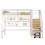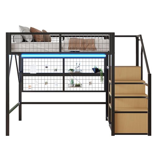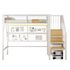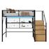 Escalier avec rangement intégré : L'escalier latéral est équipé d'étagères ouvertes et d'une penderie, idéales pour ranger livres, jouets ou vêtements, un gain de place et une utilisation pratique.