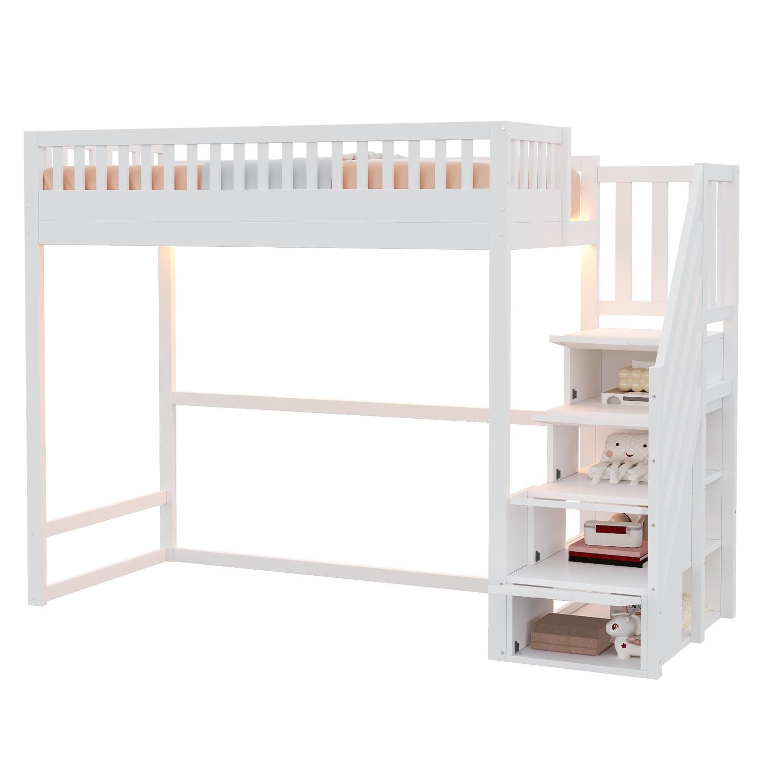 ESCALIER DE RANGEMENT INTÉGRÉ - Chaque marche latérale de l'échelle s'ouvre pour révéler des compartiments de rangement dissimulés, offrant un espace pratique pour les livres, les jouets, les vêtements, le linge de lit ou les objets du quotidien. Cette conception de rangement astucieuse permet de garder la chambre propre et organisée, éliminant ainsi le besoin de placards ou d'étagères supplémentaires.
