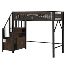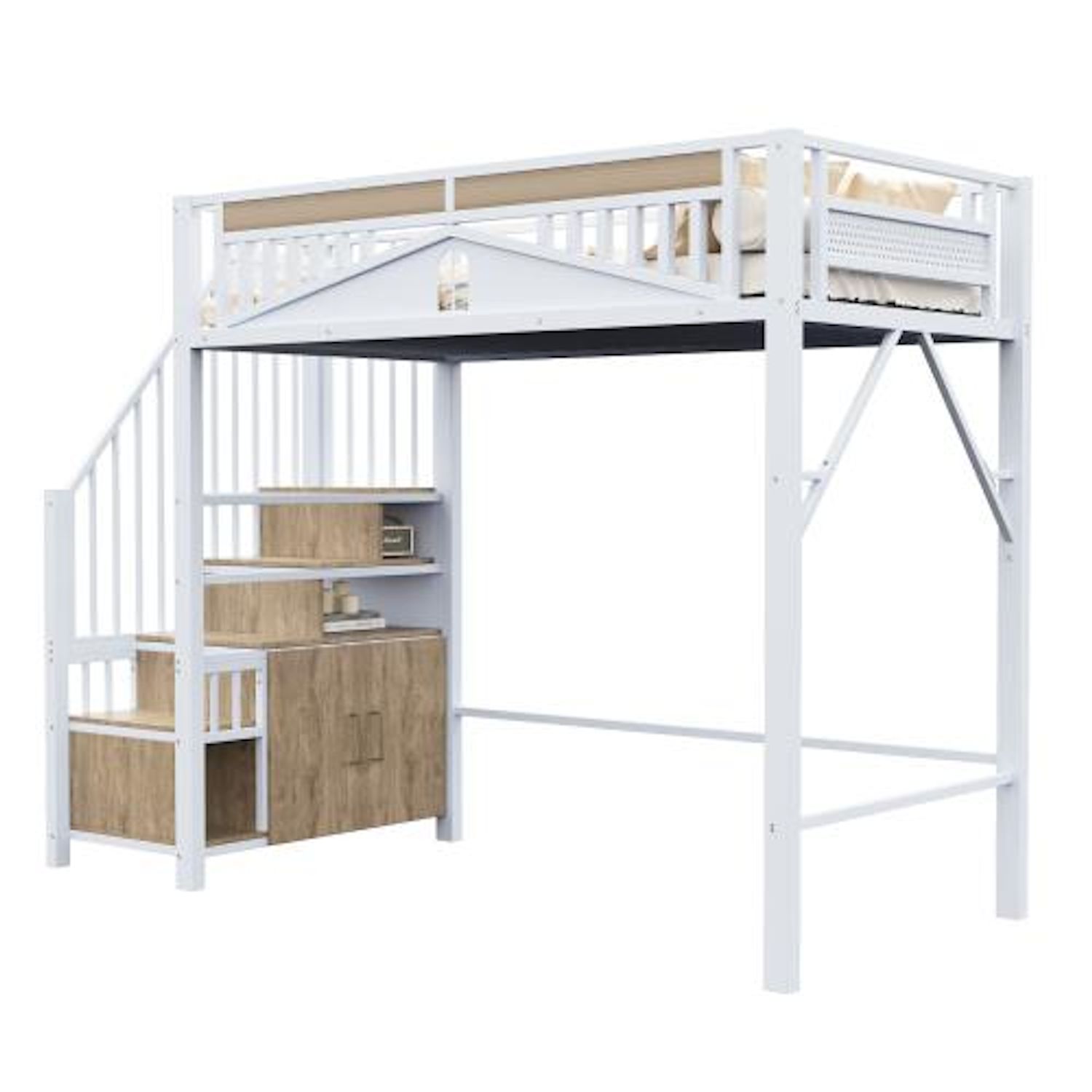 Design escalier avec rangement - Ce lit mezzanine en métal dispose d'un espace de rangement intégré sous chaque marche des éléments d'escalade latéraux, ainsi que d'un petit placard pour faciliter l'organisation et le rangement de vos essentiels.