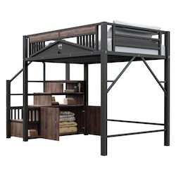 Lit mezzanine avec escalier et rangements intégrés : Ce lit mezzanine en métal est doté de rangements intégrés sous chaque marche des éléments latéraux, ainsi que d'un petit placard pour ranger et organiser facilement vos affaires.