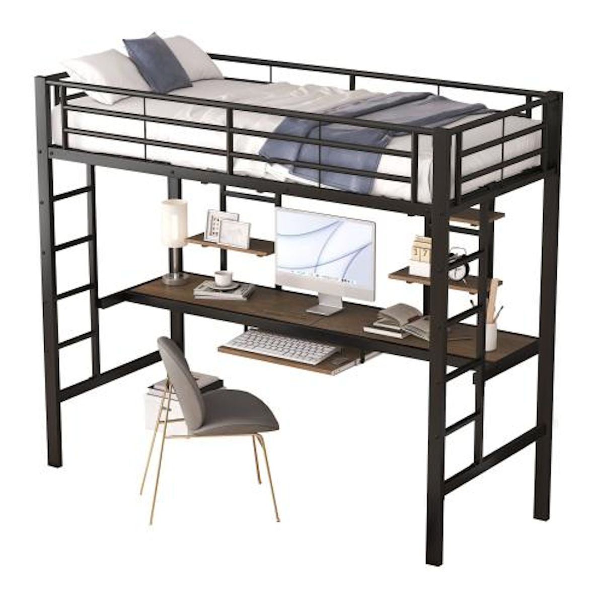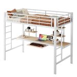 [Fonctionnalités] Notre lit mezzanine est équipé d'un bureau et de deux étagères, idéal pour travailler ou étudier. Un plateau pour clavier est également inclus. Des marches situées en haut et en bas du lit facilitent l'accès.
