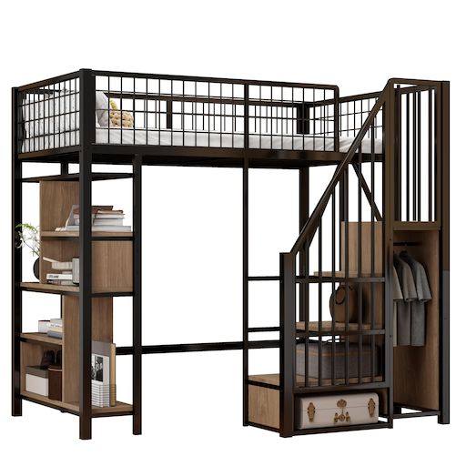 Lit avec escalier de rangement : Un escalier robuste fait également office de rangement et est idéal pour ranger chaussures, livres et autres objets essentiels.