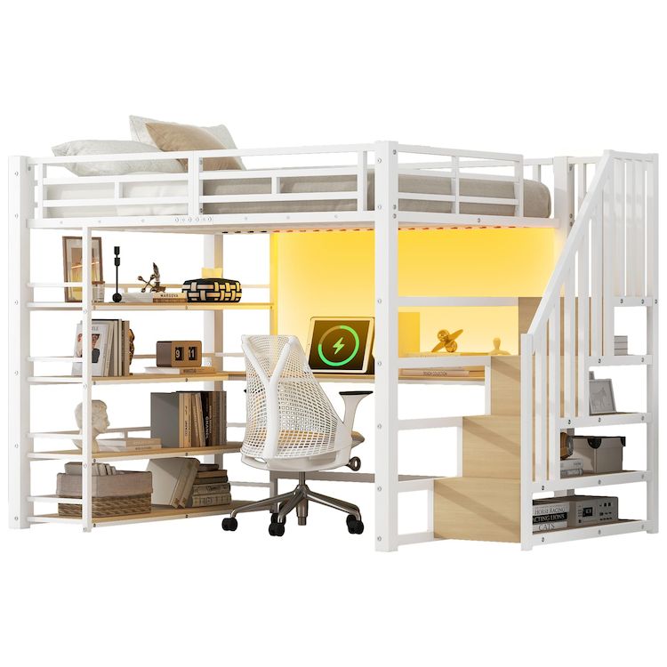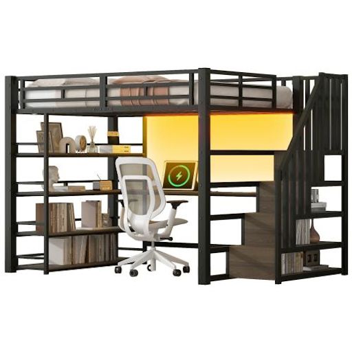 [Éclairage LED et station de recharge] L'étagère au-dessus du bureau est équipée de LED dont la couleur est modifiable via une application Bluetooth. Combiné à la station de recharge intégrée au bureau, ce lit offre un espace de travail ou de divertissement confortable.