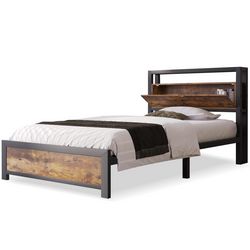 Rangement sous la tête de lit : La table de chevet est dotée d'un compartiment de rangement en similibois, pratique pour ranger de petits objets tels que des livres et des téléphones portables, augmentant ainsi l'espace de rangement de la pièce. Deux compartiments de rangement sont également disposés au-dessus de la tête de lit pour un rangement pratique des objets de collection.Rangement sous le lit : La garde au sol de ce lit est de 26,5 cm, et plusieurs rangements peuvent être placés librement pour ranger vêtements et chaussures de saison. De plus, l'espace sous le lit est dégagé et facile à nettoyer et à dépoussiérer, facilitant ainsi le nettoyage quotidien des canalisations.Design unique : La tête et le pied de lit utilisent une combinaison de lattes métalliques vintage de style campagnard pour créer un style industriel/campagnard affirmé, ajoutant une touche industrielle unique à votre pièce. La tête de lit est fabriquée en panneaux de bois imperméables et résistants aux rayures.Robuste et durable : La structure de la plateforme est soudée et fixée par vis. 12 lattes métalliques robustes et 6 pieds de support indépendants, avec une capacité de charge maximale de 120 kg.