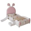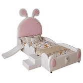 Design unique : Ce berceau en forme de lapin est fabriqué en PU, avec une surface en similicuir lisse et délicat, facile à nettoyer. Une petite poche de rangement se trouve derrière le lit, et la tête de lit est décorée d'adorables oreilles de lapin blanches et roses, lui conférant une atmosphère ludique et douillette.
