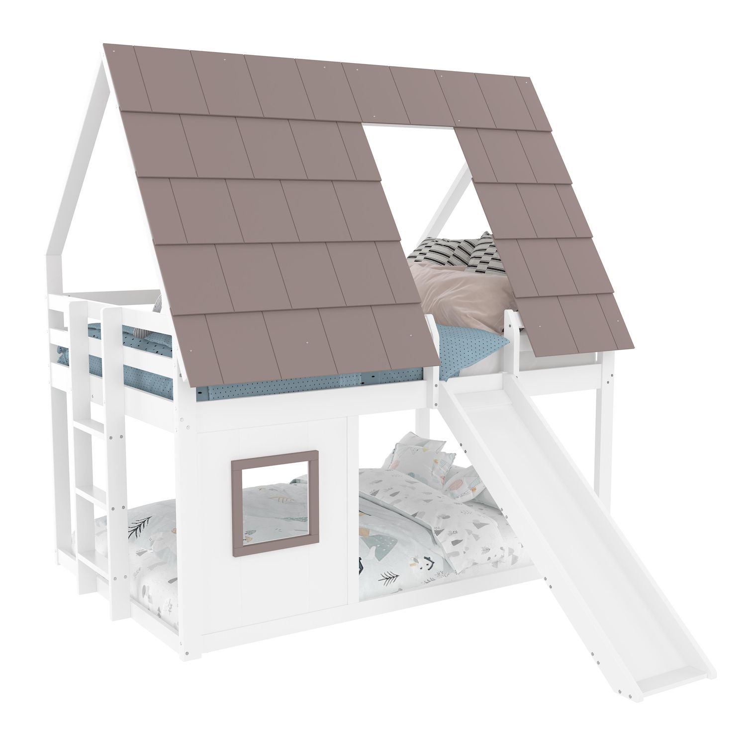 [Conception maison] Ces lits superposés en forme de maison, avec leur toit à pignon et leur paroi avec fenêtre, créent un espace agréable et charmant. Ils offrent non seulement un espace de couchage confortable, mais aussi un espace de jeu et de divertissement pour vos enfants.