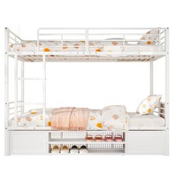 Lit superposé avec rangement à chaussures en dessous : De plus, le lit dispose d'une armoire à chaussures subordonnée qui offre un espace de rangement supplémentaire pour les chaussures et autres petits objets. Cela vous permet de gagner de la place et de garder votre espace de vie bien rangé.