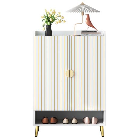 Design moderne - L'armoire à chaussures blanche mate avec doubles portes impressionne par son aspect élégant. Les rayures verticales sur les portes et les deux poignées semi-circulaires dorées lui confèrent un look moderne et élégant qui met en valeur visuellement n'importe quelle zone d'entrée.
