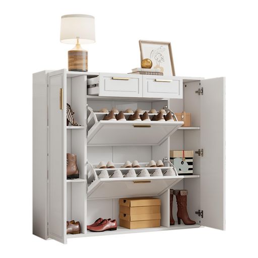 Espace de rangement polyvalent : deux petits tiroirs offrent de l'espace pour les petits objets tels que les clés ou les cartes. Le placard comprend également divers compartiments spacieux et des étagères ouvertes pratiques pouvant contenir environ 10 à 15 paires de chaussures de différentes tailles et styles.