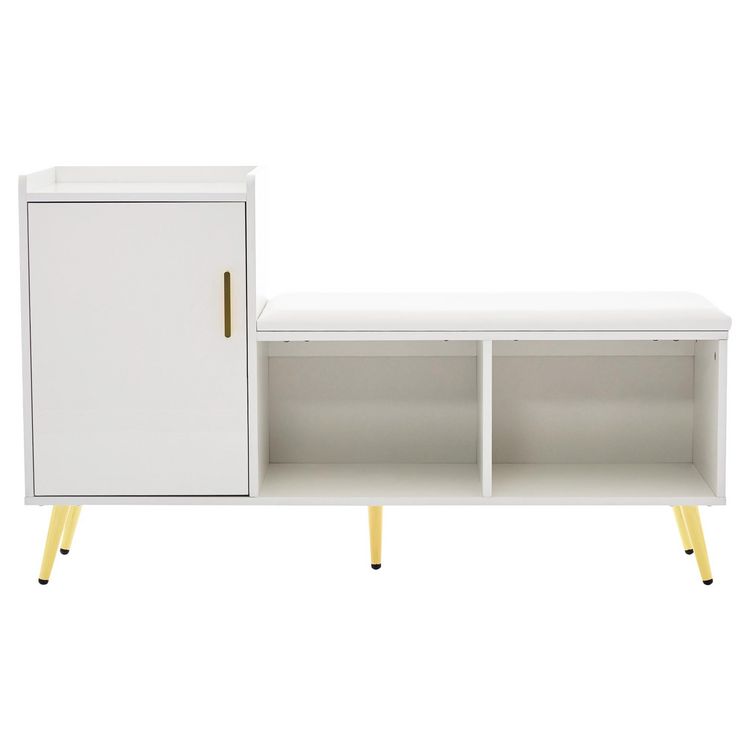 FLEXIBLE ET FACILE À ASSEMBLER : Les coussins confortables sont amovibles pour s'adapter à votre espace et à votre style. Grâce aux pièces pré-marquées et aux instructions faciles à suivre, même les débutants peuvent assembler rapidement ce meuble à chaussures. Les poignées dorées sur les portes et les pieds dorés ajoutent une touche de glamour à votre entrée.