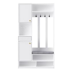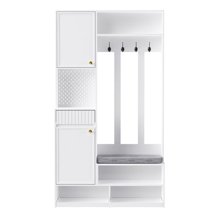 Caractéristiques de haute qualité : cet arbre de couloir multifonctionnel bannit le chaos de votre entrée ! Ce meuble élégant combine une armoire, un placard, un panneau perforé, des tiroirs et un banc rembourré - une solution complète pour une organisation parfaite dans le vestibule.
