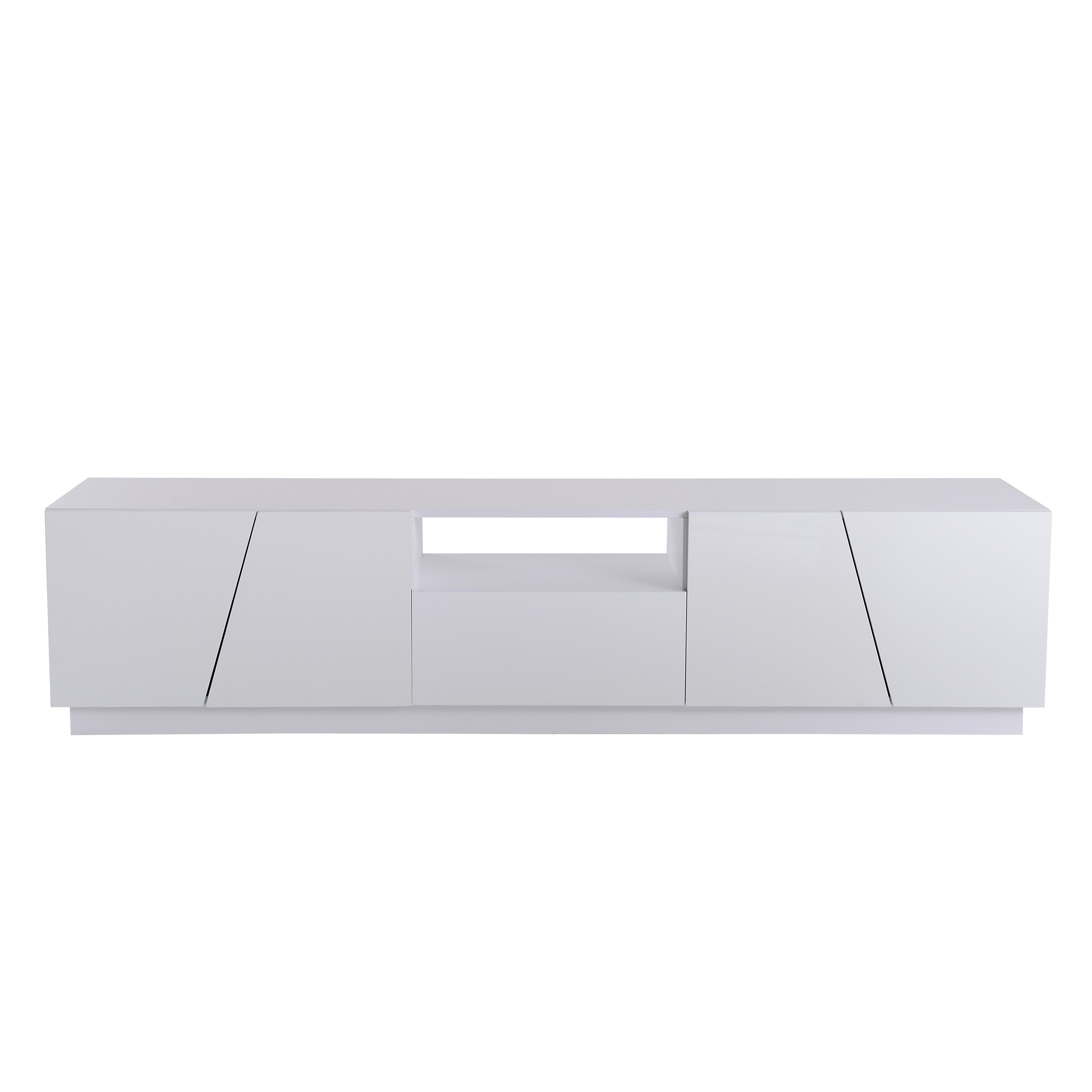 Style moderne, finition blanc brillant assortie aux panneaux de bois : élégant et raffiné. Les panneaux de porte présentent des divisions irrégulières, conférant à votre salon un caractère unique.Fabriqué en MDF de haute qualité, ce meuble est robuste et durable, et chaque panneau peut supporter un
