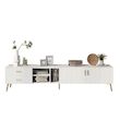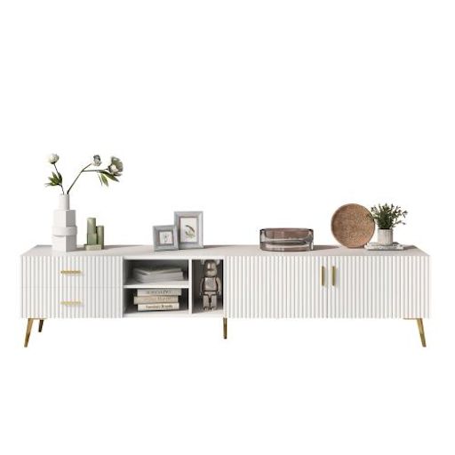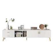 [Style moderne] Meuble TV rectangulaire avec portes d'armoire ornées de rayures verticales décoratives et pieds en métal doré texturé, pour un style à la fois léger et luxueux.