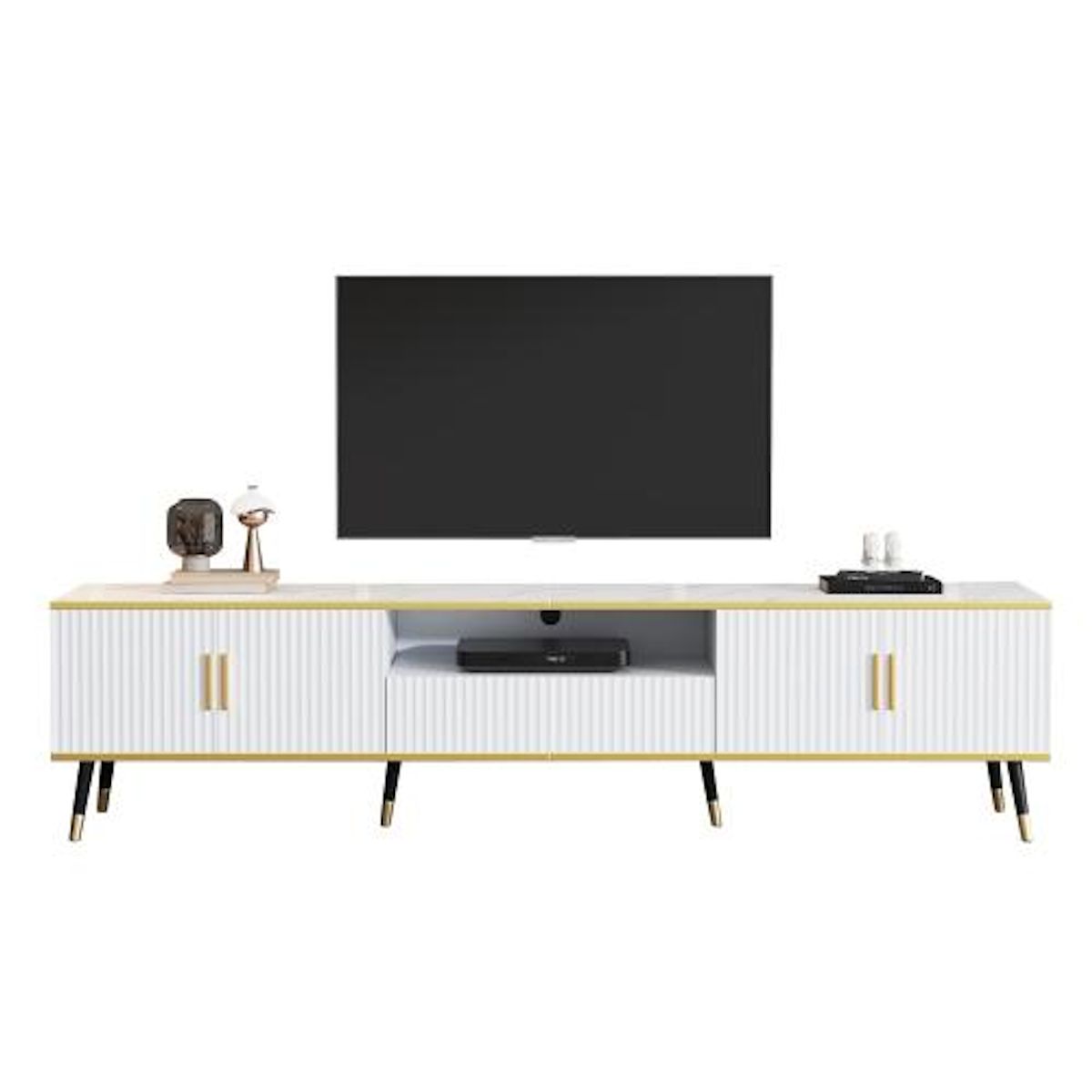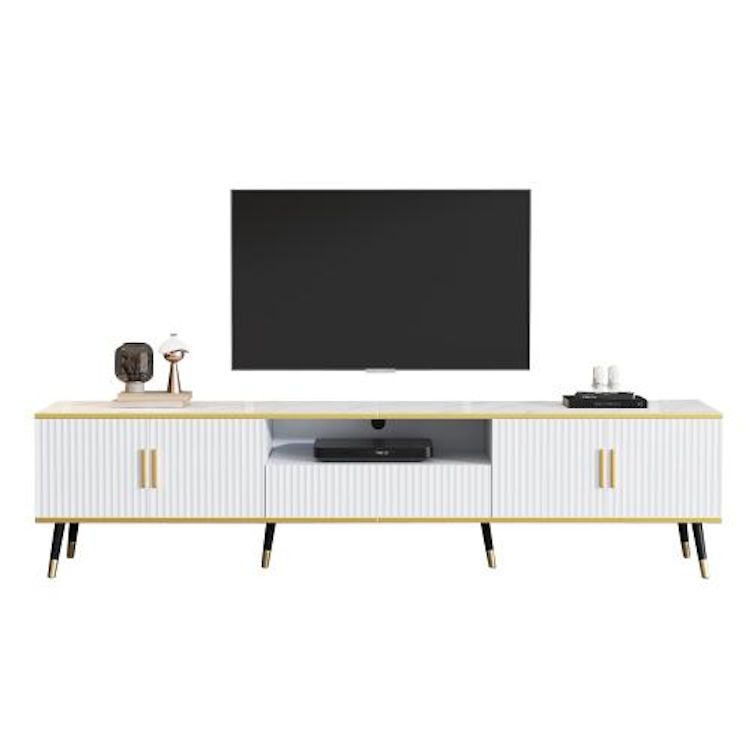 Stabilité et durabilité : Fabriqué en panneaux de particules pour une structure stable et une durée de vie prolongée. Ce meuble multimédia est doté de pieds arrondis et d'un revêtement en métal doré, créant un look élégant et raffiné.