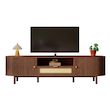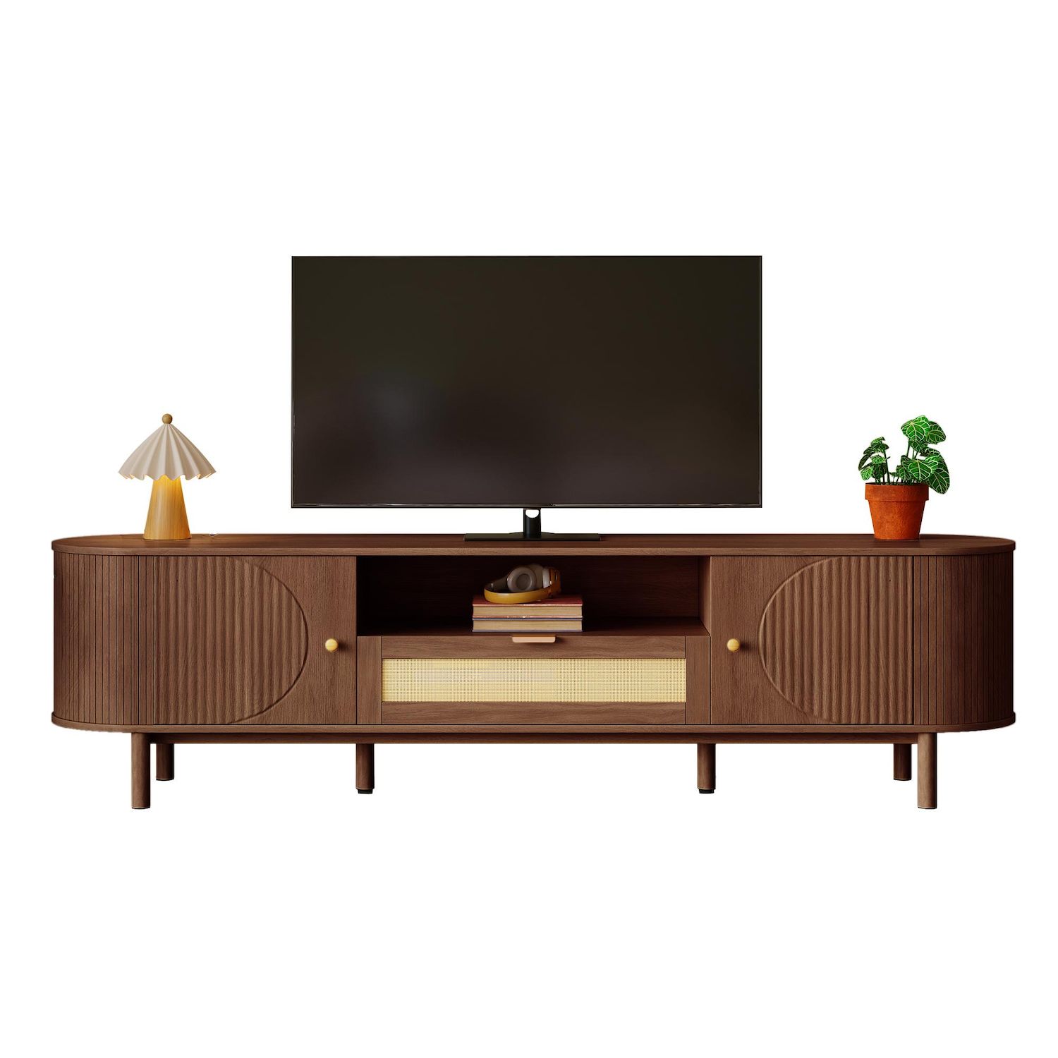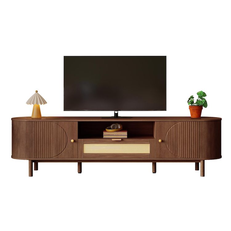 Double porte et étagères ouvertes : Ce meuble TV est doté de portes semi-circulaires sur les deux côtés, offrant un espace de rangement généreux. La partie centrale ouverte est idéale pour ranger les accessoires TV et les objets du quotidien.