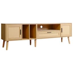 Doté de deux portes en rotin de haute qualité et d'un tiroir supplémentaire en rotin, ce meuble TV offre un grand espace de rangement pour vos appareils multimédias, DVD et autres accessoires. Trois étagères ouvertes derrière les portes offrent un espace généreux pour vos livres, objets de décoration et effets personnels. Un système de gestion des câbles est également intégré à l'arrière du meuble pour une apparence soignée.