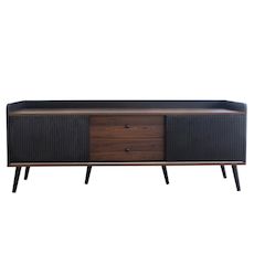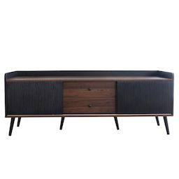 Deux portes coulissantes à rayures, de chaque côté de ce meuble TV élégant, s'ouvrent sur un intérieur spacieux doté d'étagères offrant un grand espace de rangement. Deux tiroirs avec glissières et poignées métalliques élégantes permettent un accès facile.