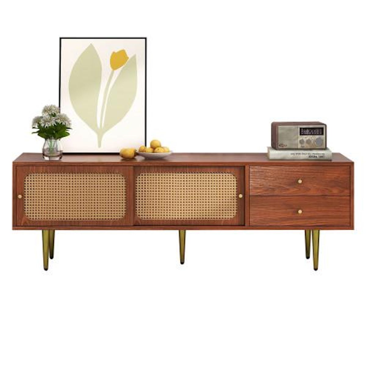 Fabriqué en MDF couleur noyer de haute qualité et en rotin synthétique résistant, ce meuble TV allie durabilité et esthétique. Ses élégants pieds en métal surélèvent le meuble de 25 cm, facilitant le rangement de vos produits d'entretien.