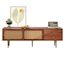 Ce meuble TV allie avec élégance le MDF couleur noyer au rotin synthétique couleur café, créant ainsi un mariage parfait entre esthétique et fonctionnalité. Doté de deux tiroirs et de deux portes coulissantes chics, il offre un espace de rangement généreux et une grande flexibilité d'adaptation à vos besoins.