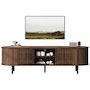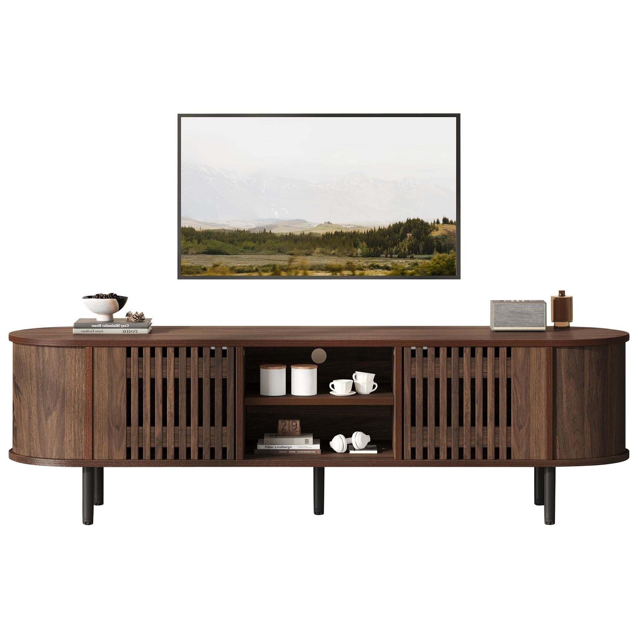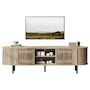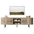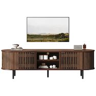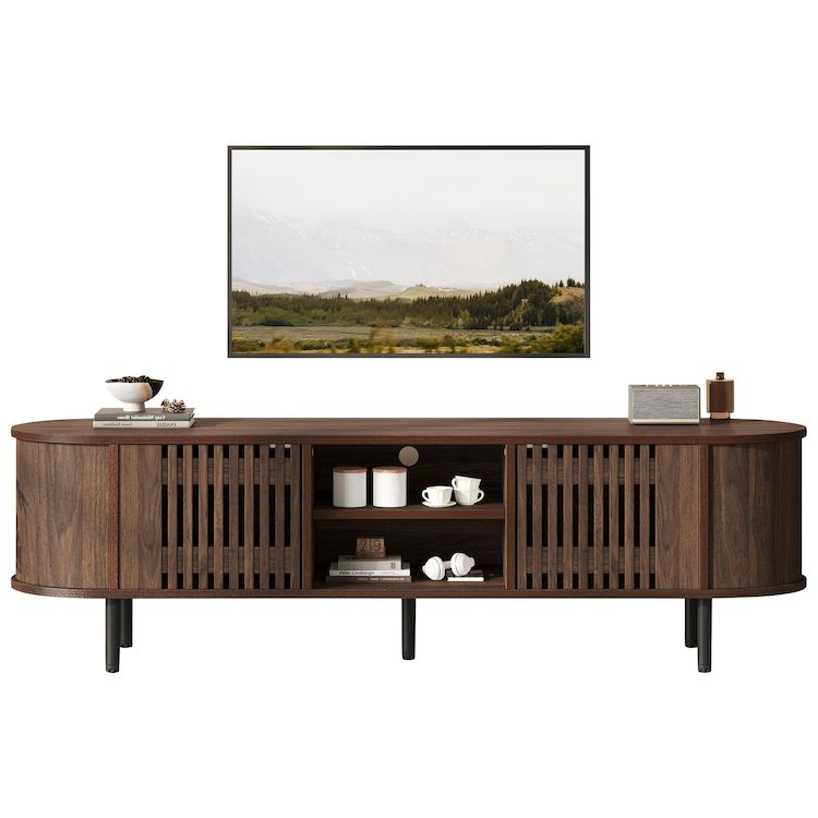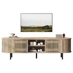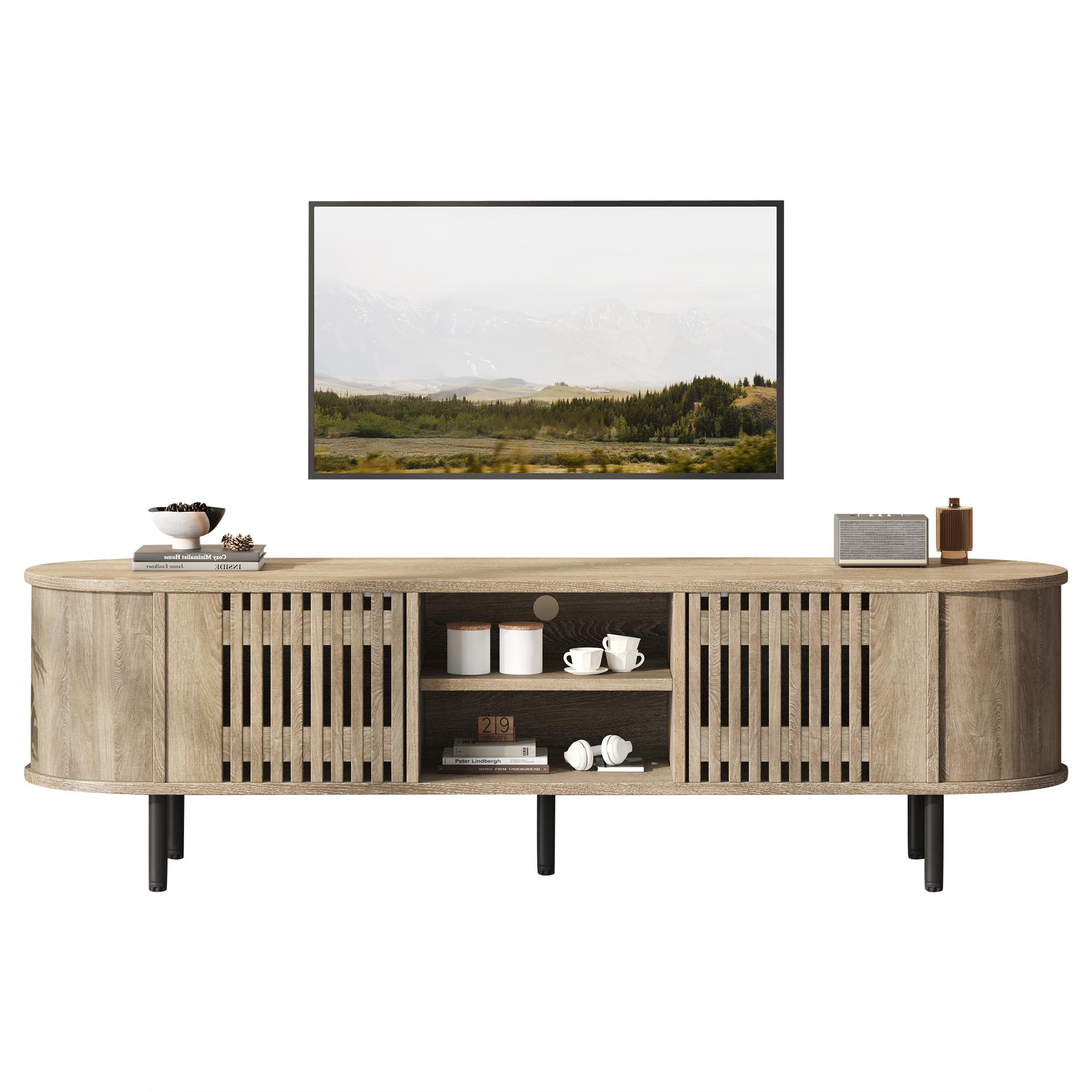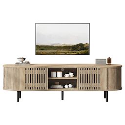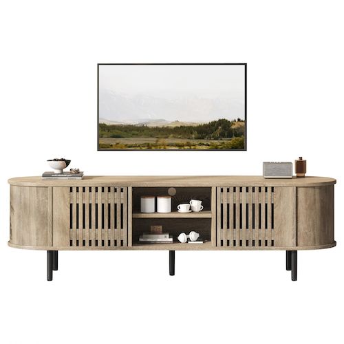 Design : Les portes du meuble, en lattes de bois aux bords ovales, offrent un style simple et naturel. Placé dans le salon, ce meuble sert à la fois d'espace dédié à la télévision et d'élément décoratif qui embellit la pièce.