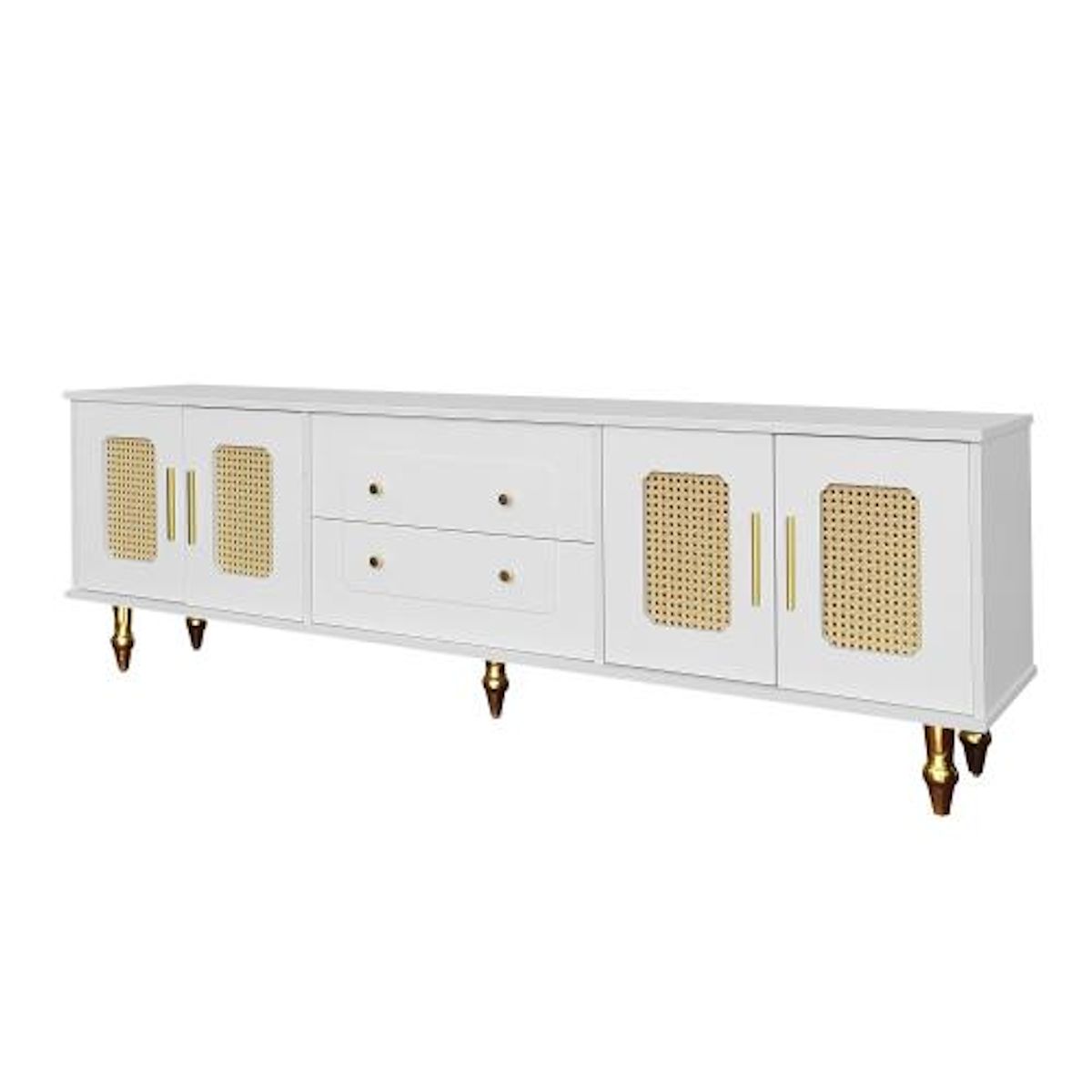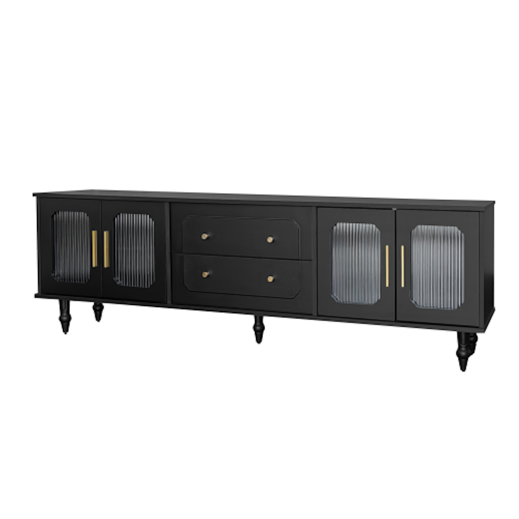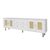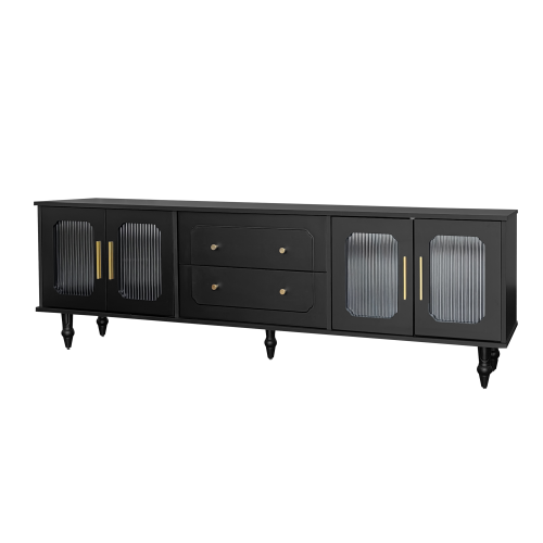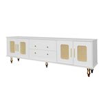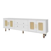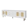 Portes vitrées en rotin : Quatre portes en rotin PVC offrent une esthétique charmante et une touche naturelle au meuble.Tiroirs élégants : Les tiroirs à ouverture par pression offrent un grand espace de rangement et s'ouvrent facilement.POIGNÉE DORÉ : L'élégante poignée dorée ajoute une touche de lu