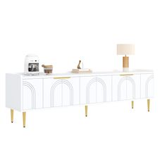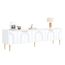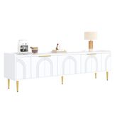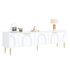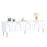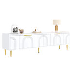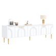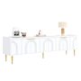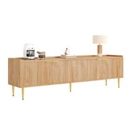 Élégantes finitions dorées : Ce meuble TV est doté de poignées dorées finement texturées et de pieds en métal qui créent un effet visuel saisissant. La surface métallique résistante à la rouille garantit une brillance durable, une grande robustesse et une couleur inaltérable. L'élégant doré s'harmonise parfaitement avec la structure en bois, créant un style doux et sophistiqué.