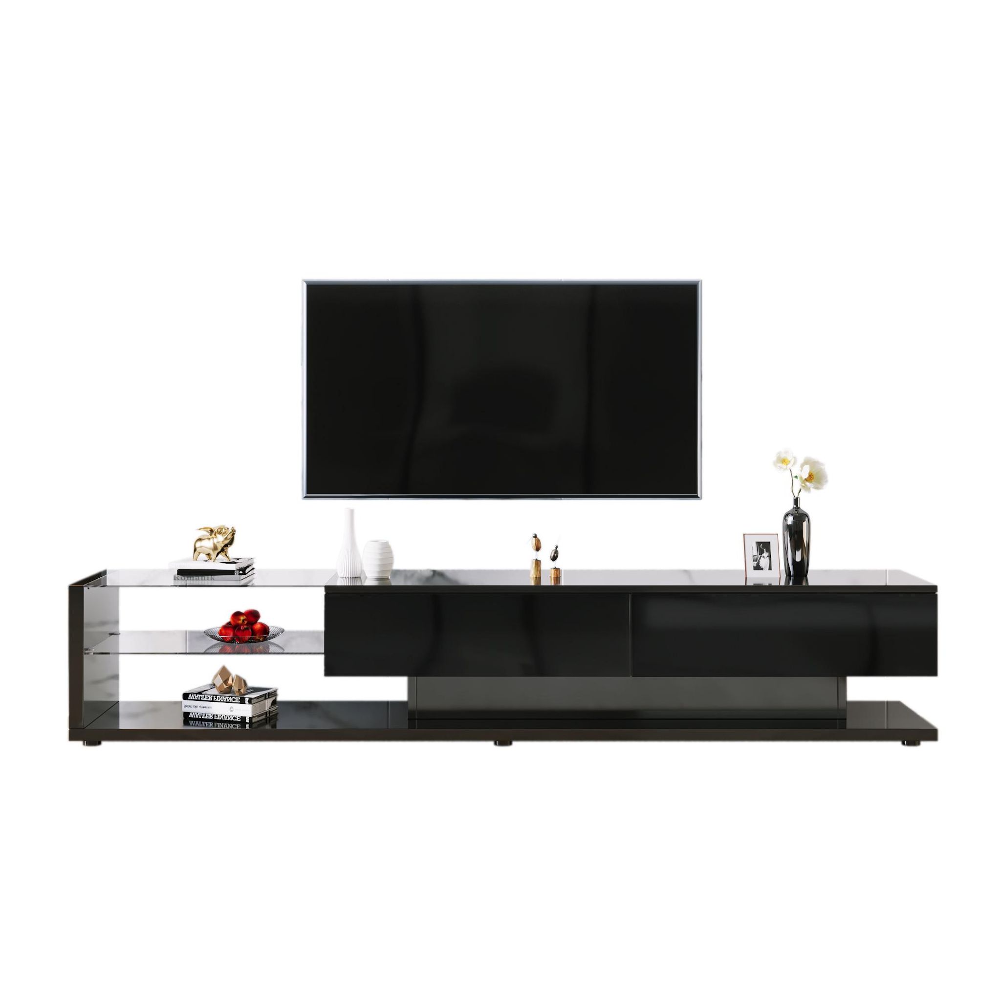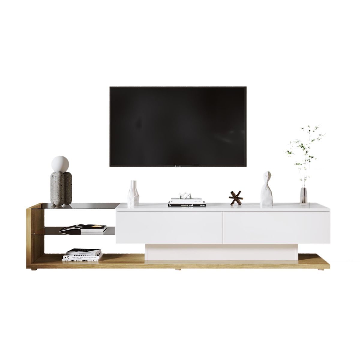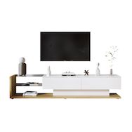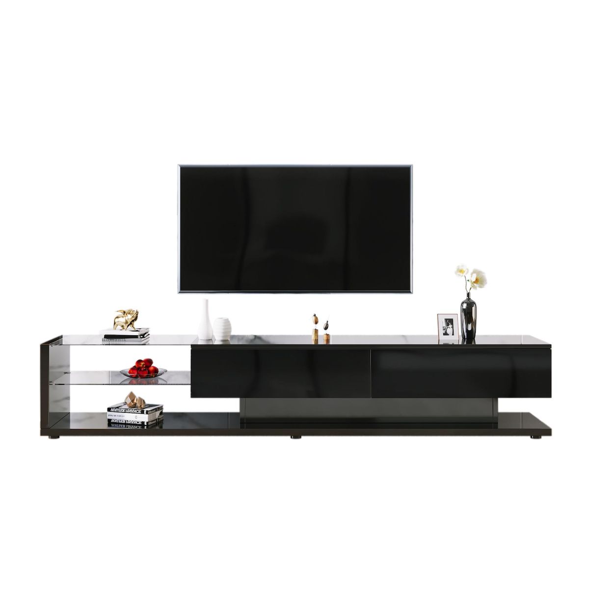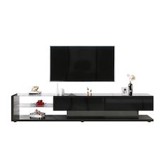 Rangement astucieux : Deux tiroirs spacieux et deux étagères en verre offrent un espace généreux pour vos appareils et permettent de garder votre salon bien rangé.