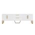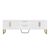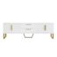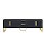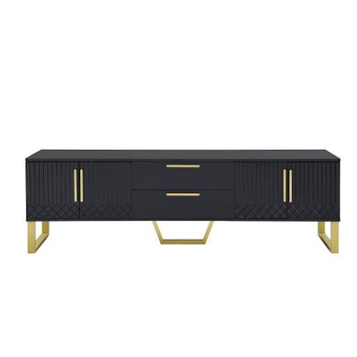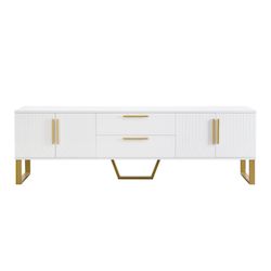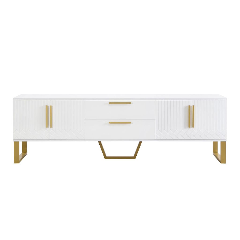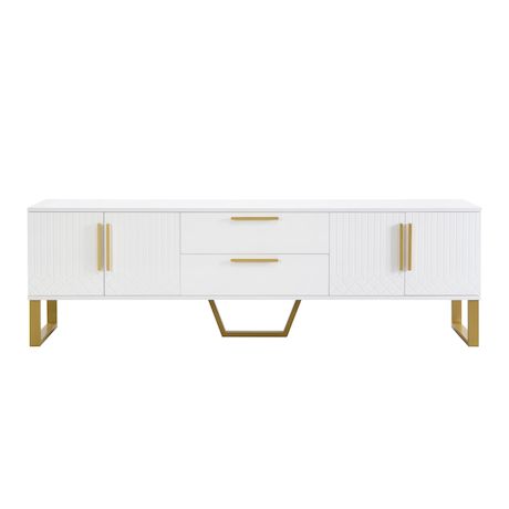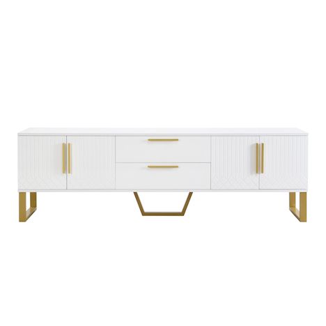 La finition brillante s'étend sur toute la surface du meuble TV, apportant à votre salon une touche de luxe, de luminosité et de chaleur. Les poignées et les pieds dorés ajoutent une note raffinée, tandis que le design unique des pieds confère une élégance supplémentaire.