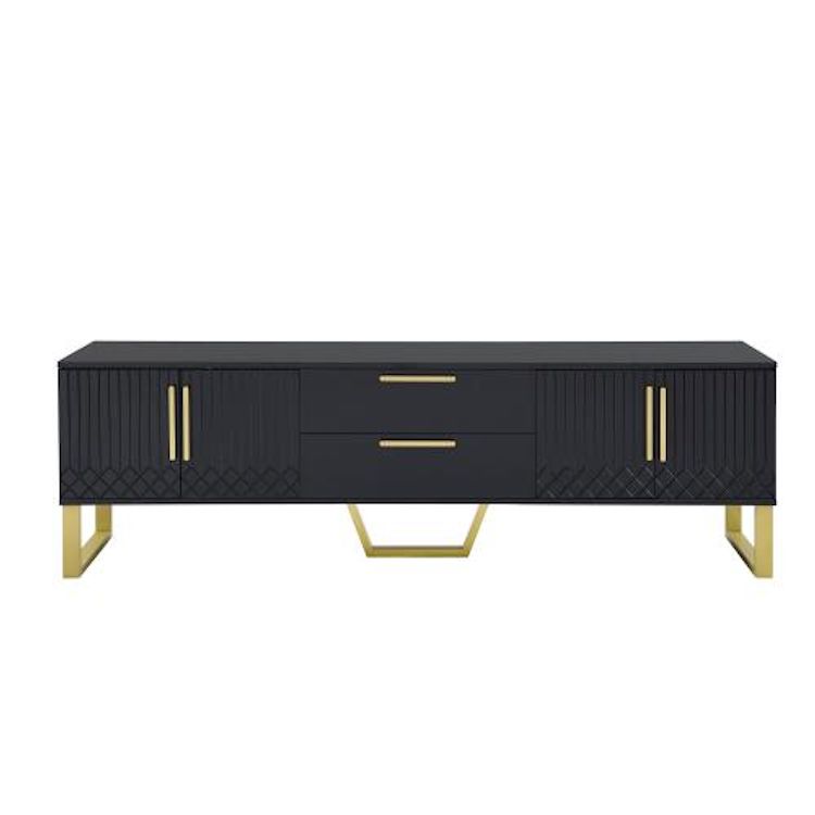 Ce meuble TV est doté de quatre portes, dont deux tiroirs finement travaillés au centre. Les portes sont ornées de délicates sculptures qui, grâce à leur finition brillante, créent un jeu d'ombres et de lumières unique.