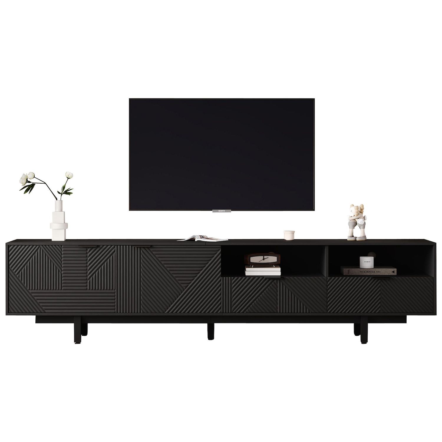 CONCEPTION ÉLÉGANTE DE LIGNE GÉMÉTRIQUE NEUTRE : Parfait pour ajouter une touche moderne et abstraite à n'importe quelle pièce. Cette conception de ligne frappante combine la simplicité d'un meuble TV avec des accents abstraits pour créer un look sophistiqué et élégant, parfait pour un espace de vie élégant.
