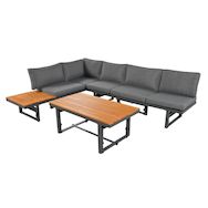 Dimensions du produit : Canapé (L x P x H) 186 x 64 x 70–76 cm, Table (L x P x H) 110 x 60 x 45–62 cm, Hauteur avec les coussins relevés : 94 cm, 84 cm, 74 cm. Comprend 6 coussins d'assise, 6 oreillers et 2 plateaux en bois d'acacia. Chaque siège supporte