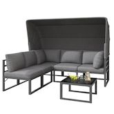 Ensemble de mobilier de jardin : Un ensemble de quatre pièces comprenant un canapé trois places, deux fauteuils et une table basse, avec des coussins moelleux et un pare-soleil dépliable pour une détente absolue.