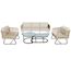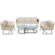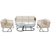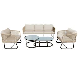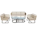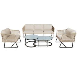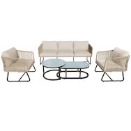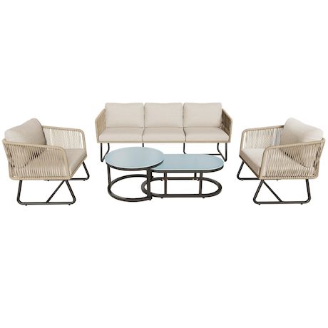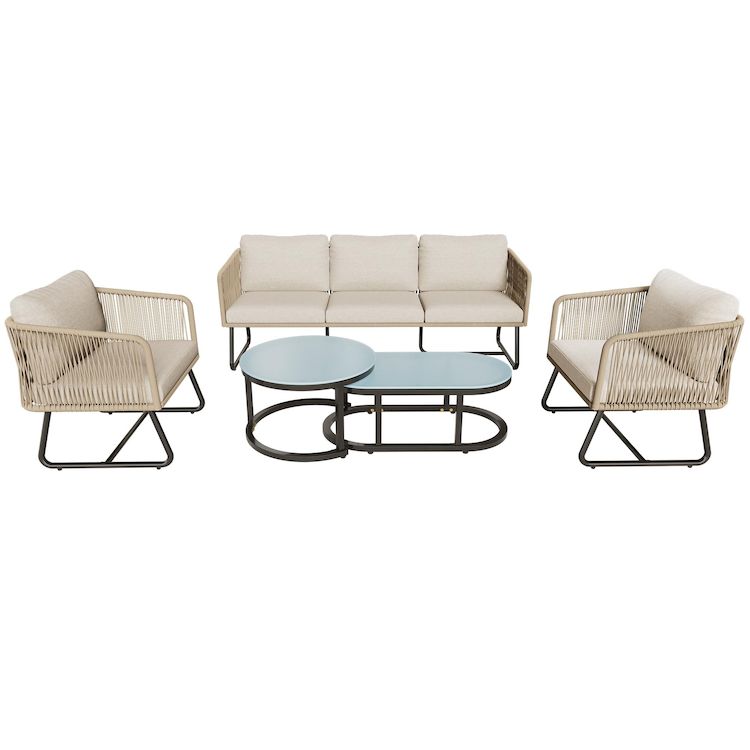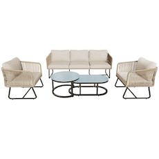 Ensemble de mobilier de jardin moderne : Cet ensemble comprend un élégant canapé trois places, deux grands fauteuils individuels et deux tables basses pratiques. Son esthétique moderne, alliée à un charme rétro, met l'accent sur votre confort grâce à