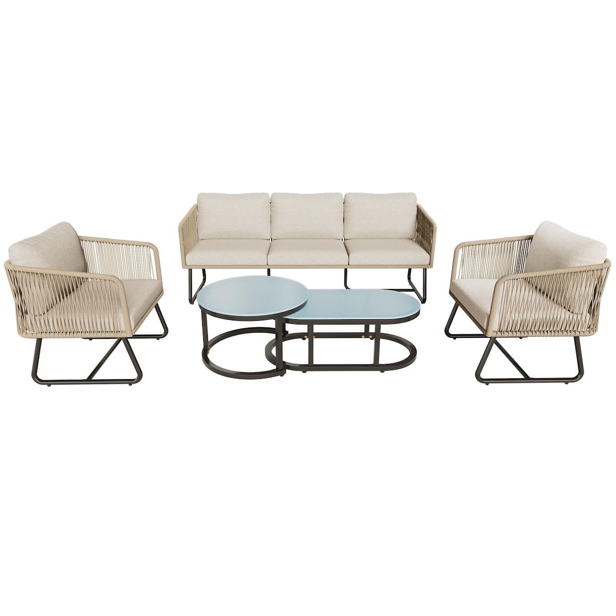 Matériaux de haute qualité : Le plateau de la table basse est en verre et facile à nettoyer. Les accoudoirs et les dossiers des fauteuils sont tressés à la main en corde. Esthétique et pratique : Résistant à la pluie, au soleil, au vent et aux intempéries.