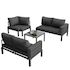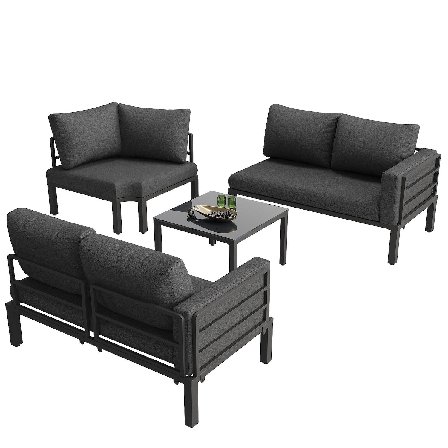 Matériaux de haute qualité : Le plateau de la table basse est en verre trempé, facile à nettoyer. Les accoudoirs et le dossier du canapé sont en fer galvanisé, à la fois esthétiques et résistants aux intempéries (pluie, soleil, vent).