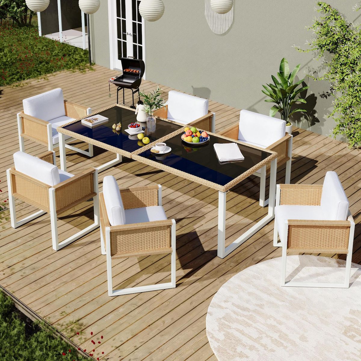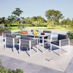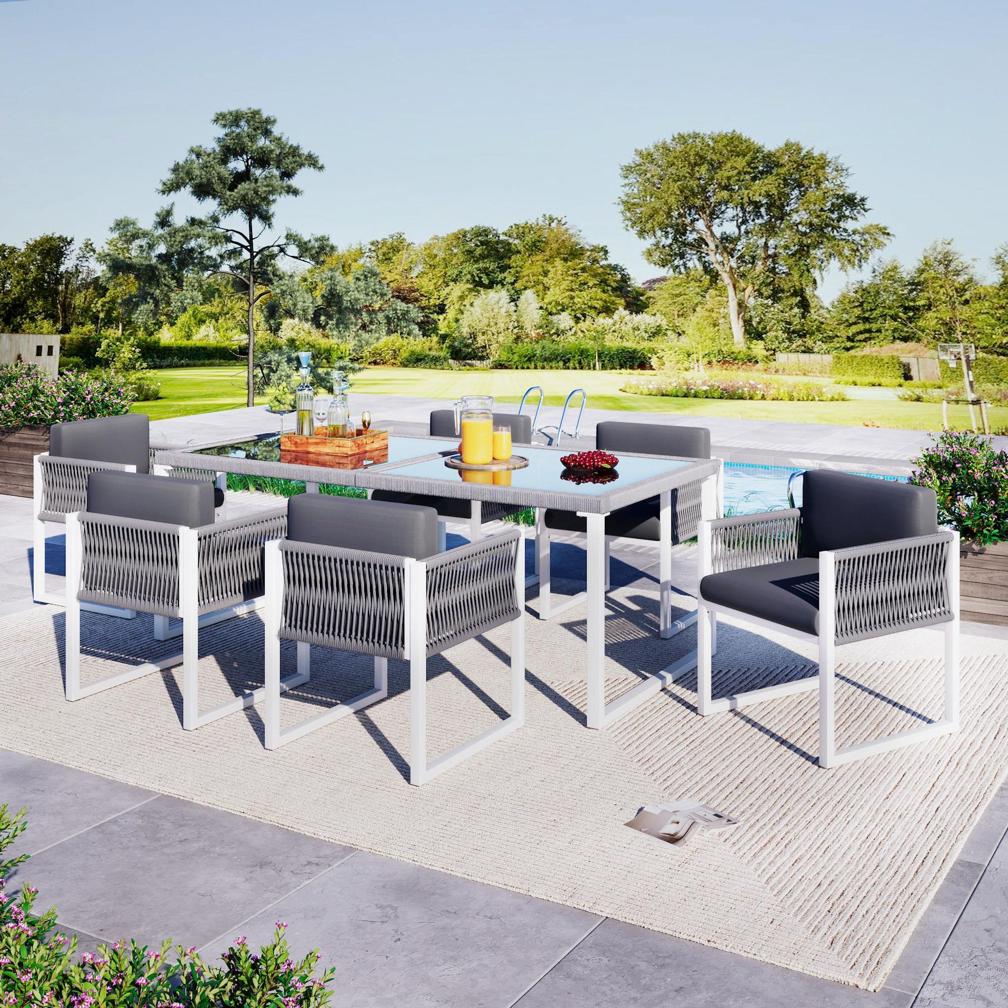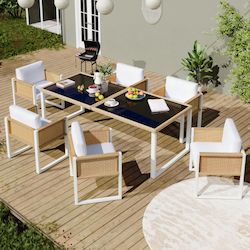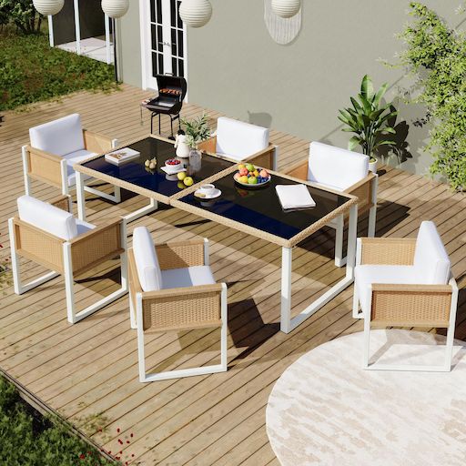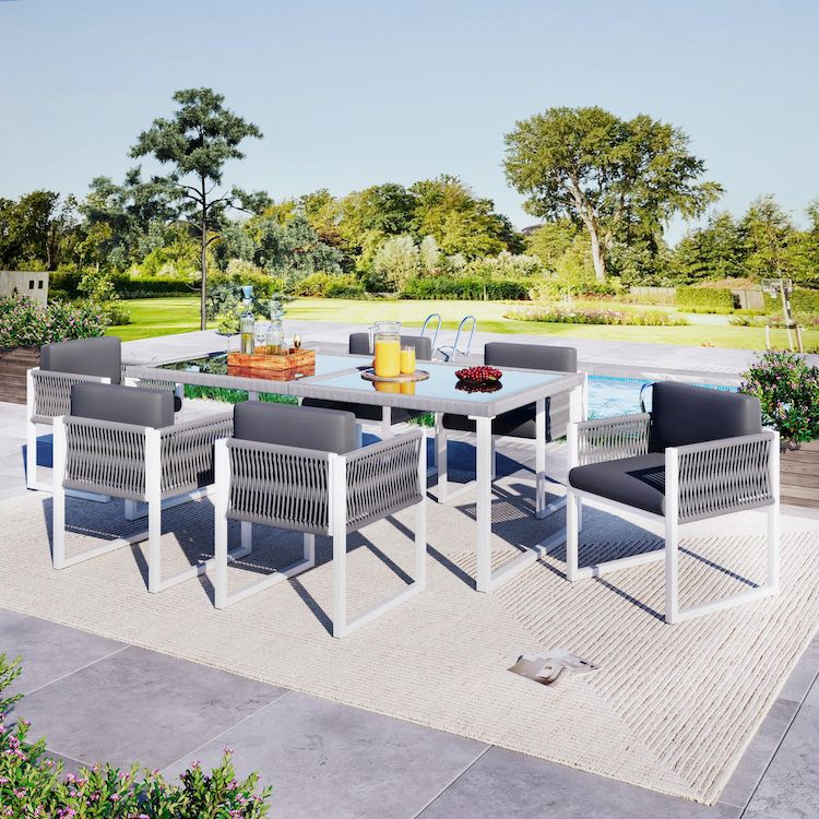 Cet ensemble de salle à manger, composé d'une table (170 x 80 x 75 cm) et de six chaises (55 x 55 x 80 cm), est idéal pour les repas en famille et en plein air. Le plateau en verre trempé est non seulement résistant à la chaleur et stable, mais il crée
