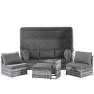 Salon de jardin 6 places en Rattan avec canapé à toit, pouf, fauteuils et table, gris