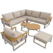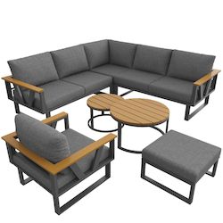 Structure robuste et durable : Le mobilier repose sur une base métallique solide, garantissant une grande stabilité et une longue durée de vie. Les accoudoirs larges, en composite bois-plastique, allient un aspect naturel à une haute résistance aux intempéries.