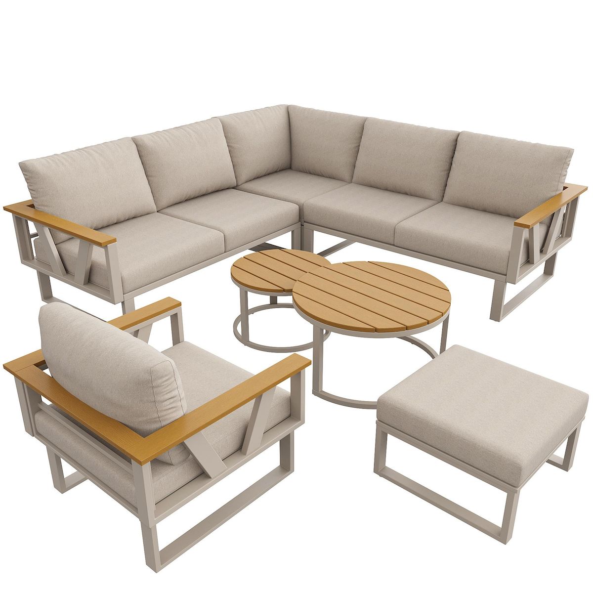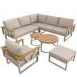 Salon de jardin 7 places en fer avec canapé, fauteuil, repose-pieds et 2 tables bois