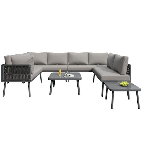 Salon de jardin 8 places en métal avec 4 canapés et 2 table, coussins et pieds réglables,gris