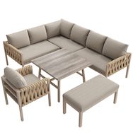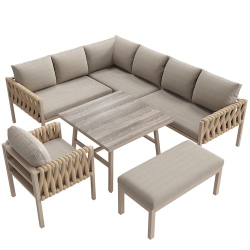 présente une finition en bois veiné à la fois esthétique et facile d'entretien. Les accoudoirs et les dossiers sont tressés en corde, un matériau non seulement élégant, mais aussi pratique : ils résistent à la pluie, au soleil, au vent et aux intempéries.