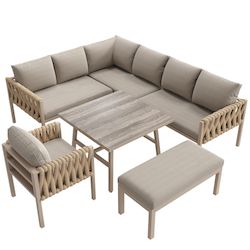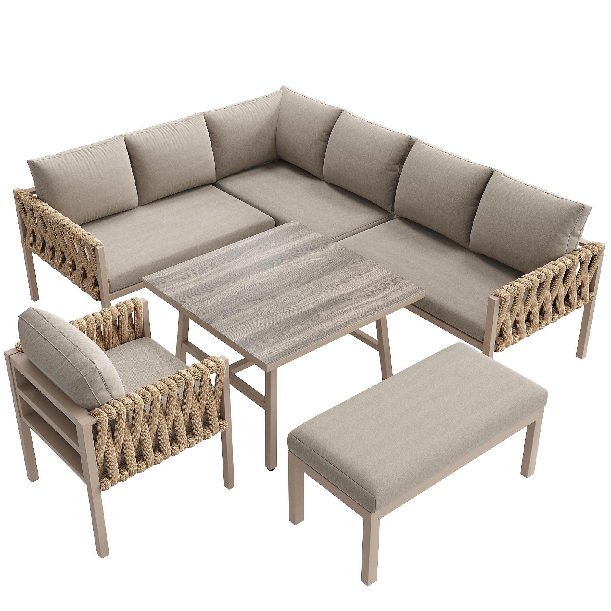 ENSEMBLE DE MOBILIER DE JARDIN MODERNE : Cet ensemble de mobilier de jardin comprend un canapé d'angle extra-long, un fauteuil, une banquette et une table basse pratique. Il allie esthétique moderne et élégance. Votre confort est notre priorité absolue
