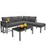 Salon de jardin angle 5 places en fer avec 2 tables basses, coussins, gris